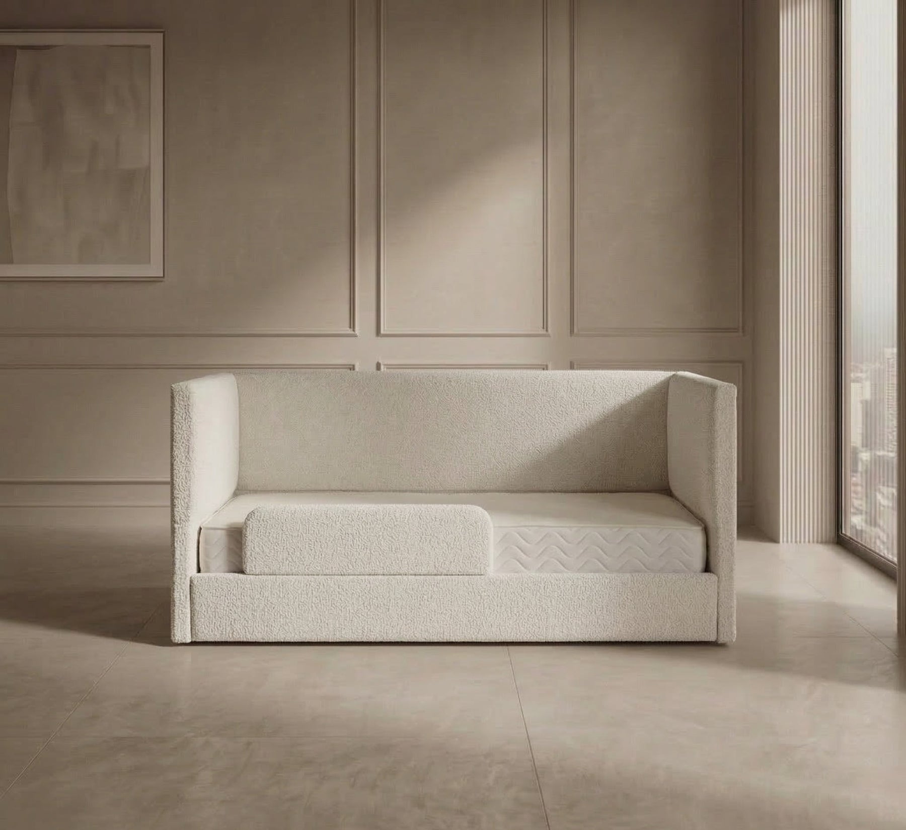 The Chantilly + Barrier Upholstered Bed is ideal for Whether you're helping your child settle in for a cosy night or encouraging independent sleep, this bed is the perfect choice. Designed with a barrier that curves and a luxurious padded finish, it offers both comfort and style—making bedtime something to look forward to. The side rails and foot end are padded and upholstered in your choice of over 40 fabrics, adding a soft yet sophisticated touch to your bedroom. This bedframe is constructed from a solid hardwood mix, offering exceptional strength and stability.